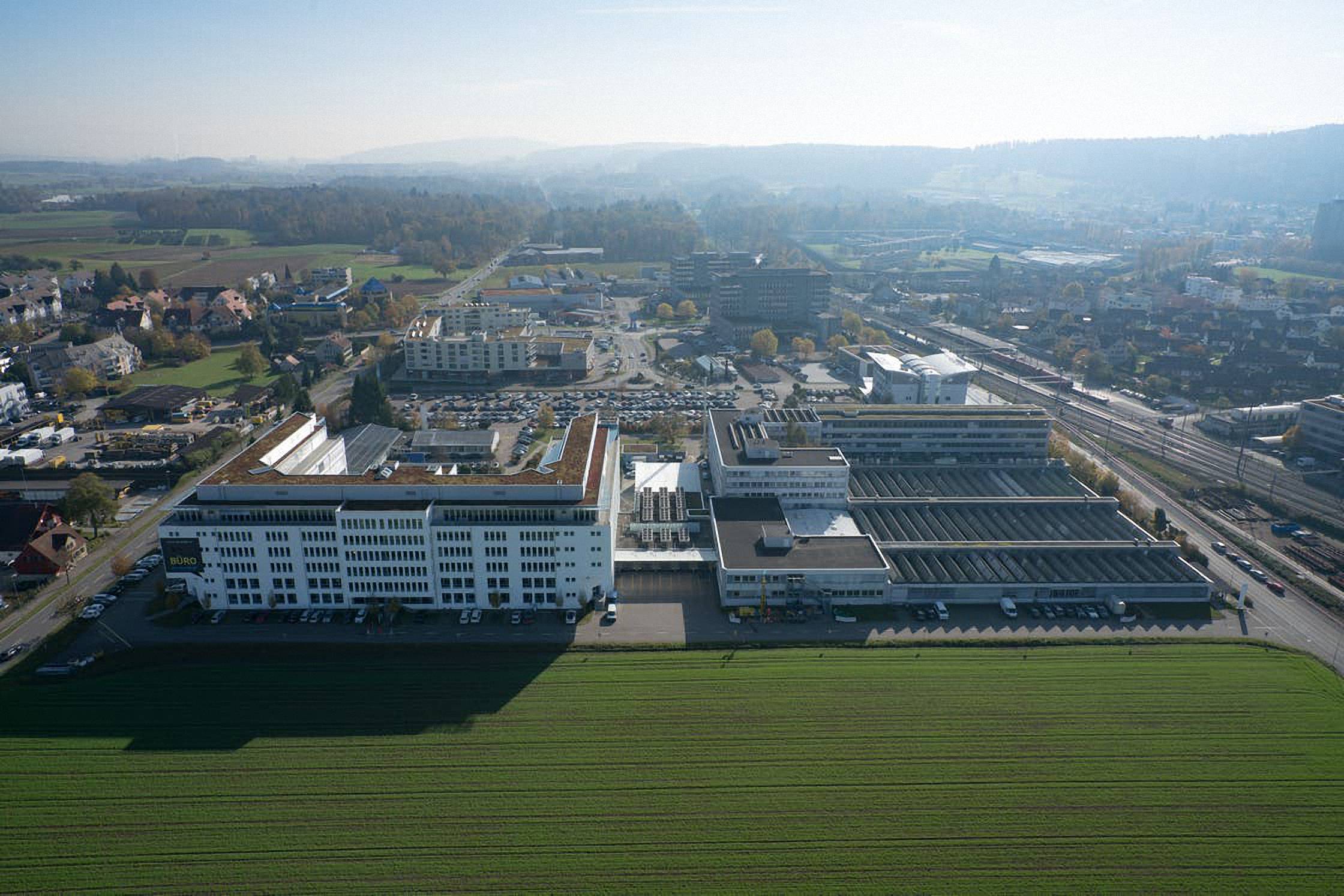 Das Gebäude-Ensemble ist eingebettet in eine gepflegte Umgebungsanlage mit Wegen, kleineren Plätzen, begrünten Flächen und Sitzgelegenheiten. Die kurzen Gehdistanzen fördern den informellen Kontakt unter den Mitarbeitenden und zwischen den Firmen.